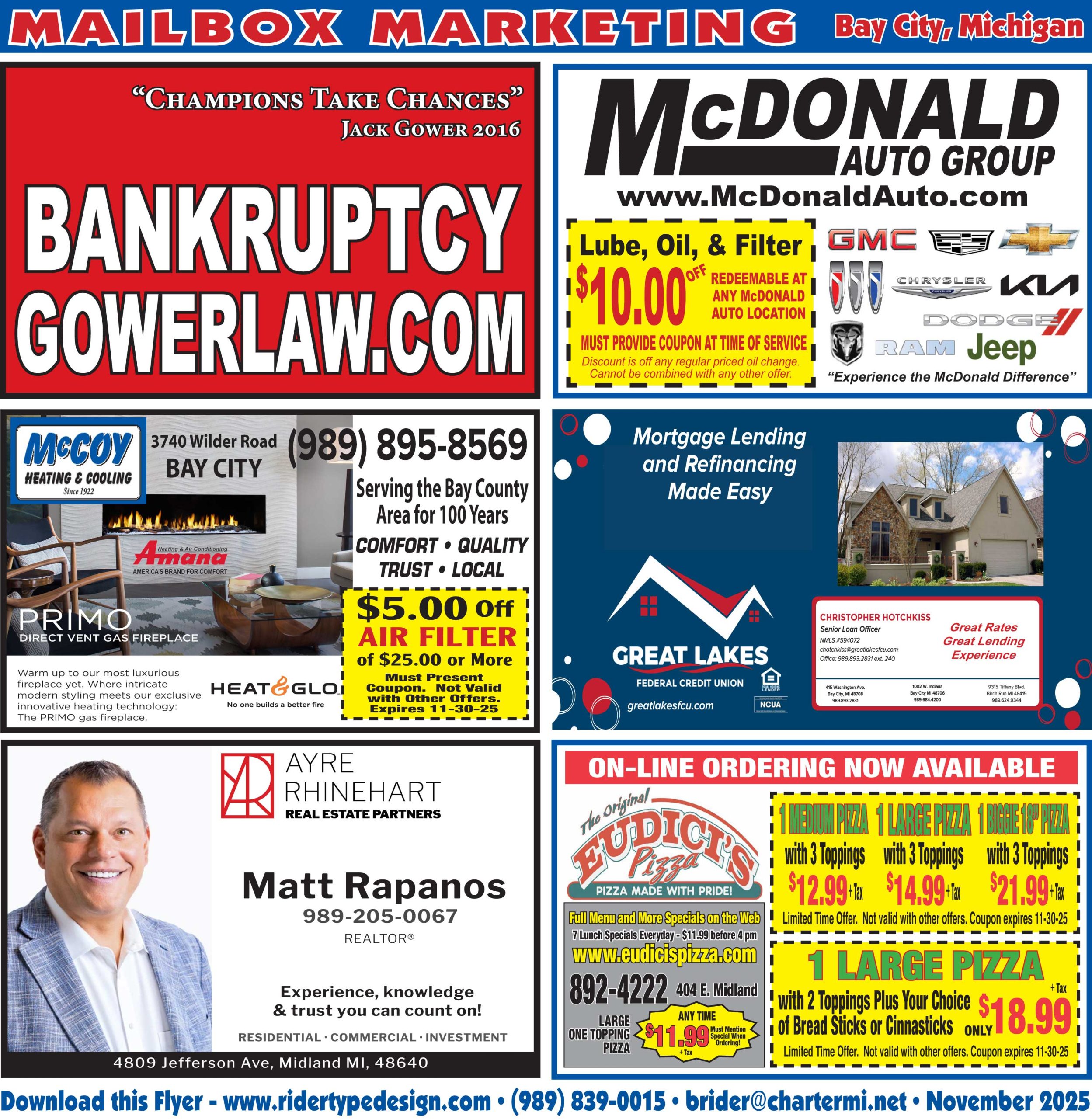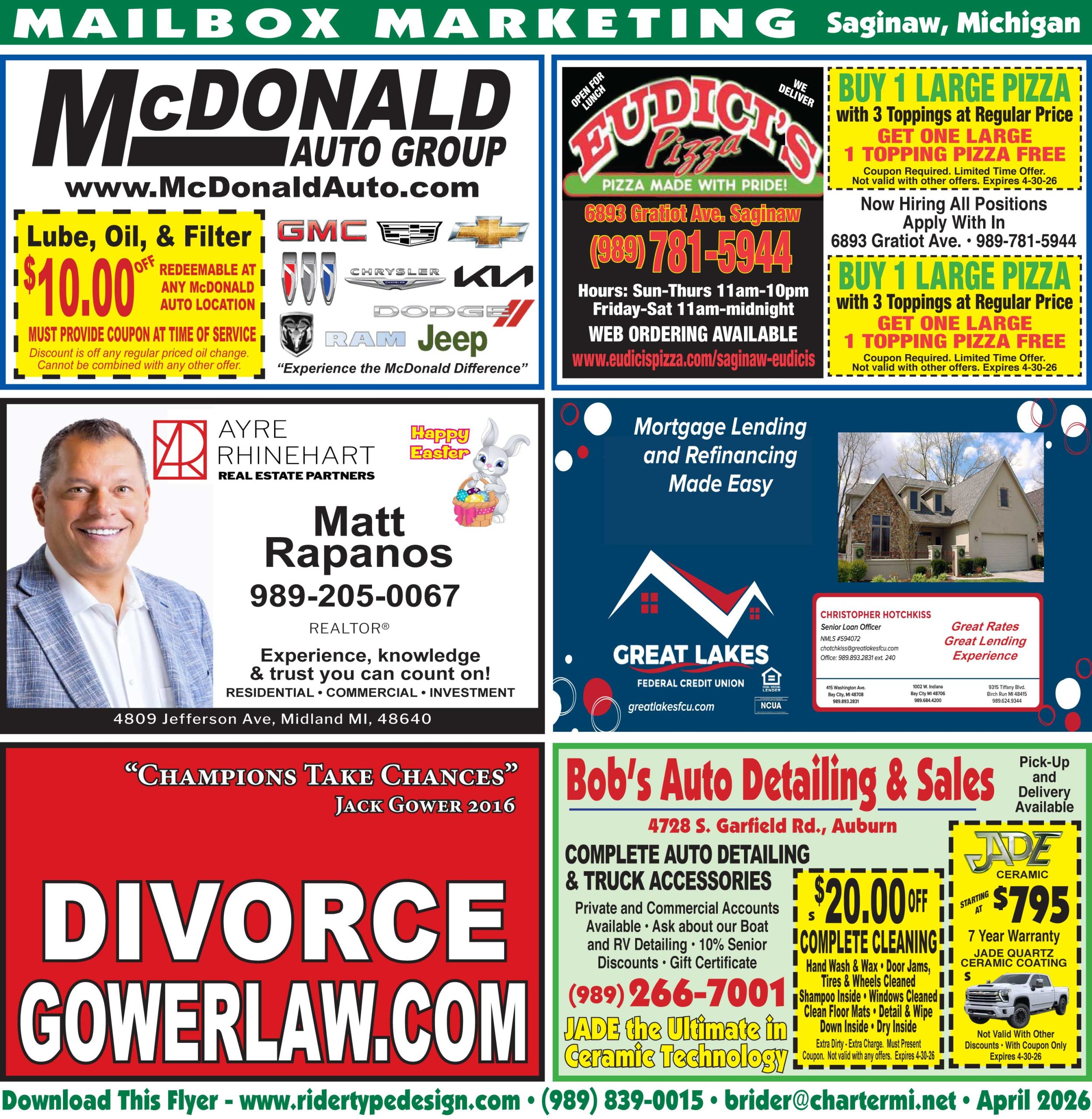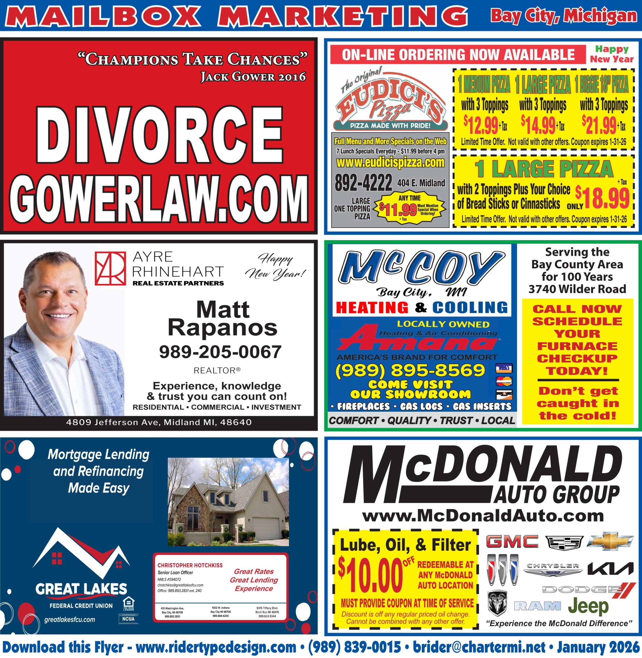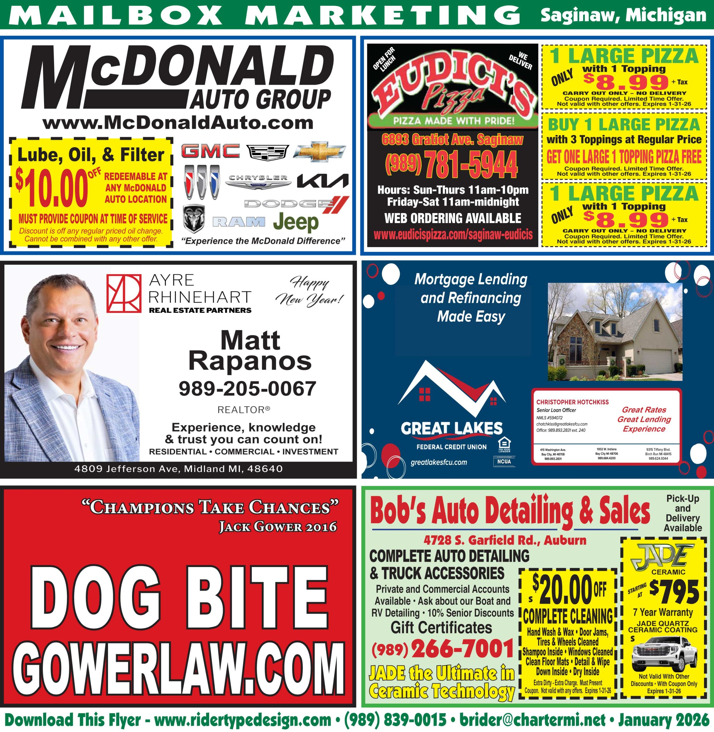 Rider Type and Design prides itself on producing and distributing a professional and popular marketing flyer throughout Midland, Saginaw and Bay Counties. Relatively inexpensive, and extremely effective, the marketing flyer that is distributed throughout this targeted area is a proven success.